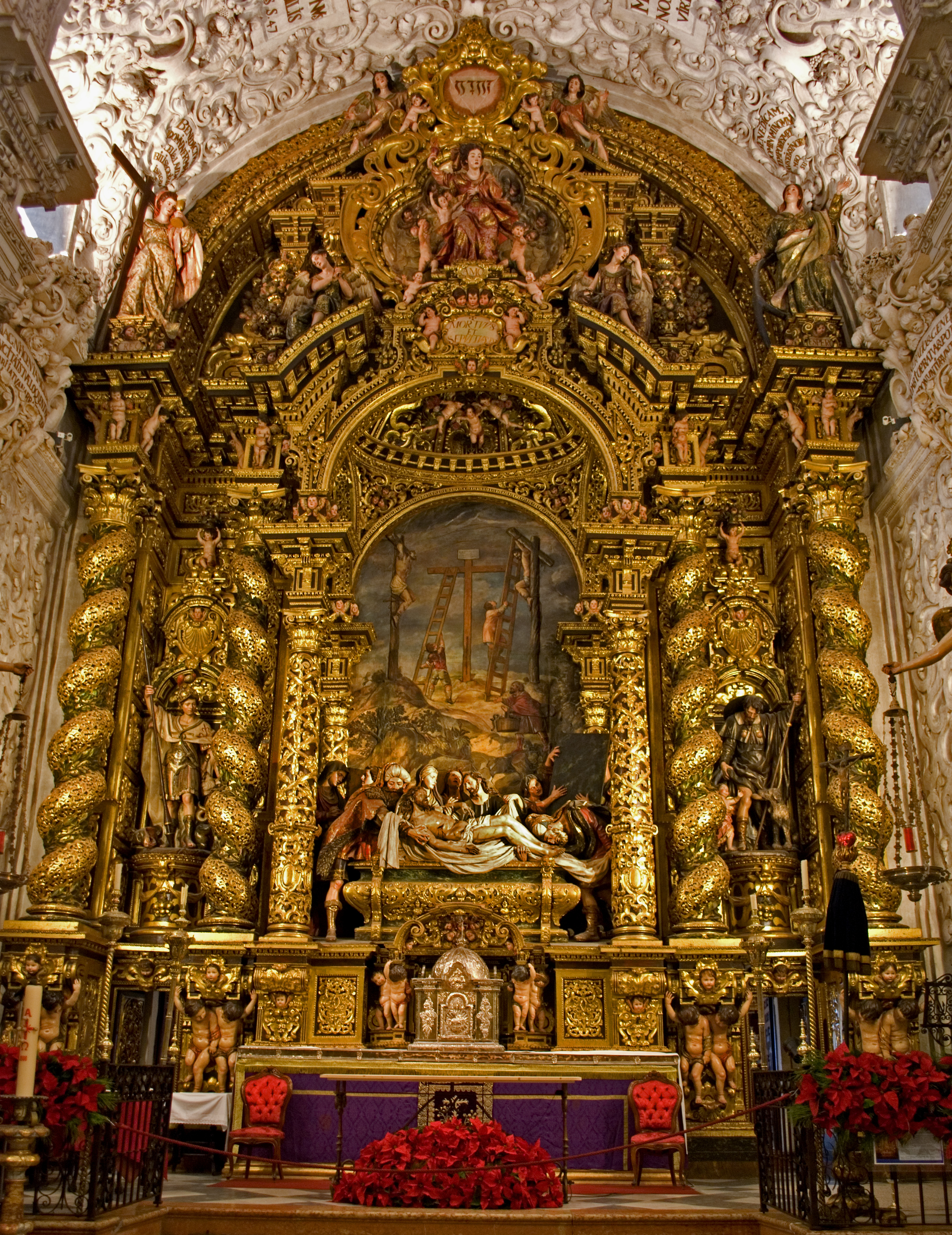 El Retablo Mayor, realizado entre 1670 y 1675, es obra de Bernardo Simón de Pineda y las esculturas de Pedro Roldán, siendo la policromía de Valdés Leal. En su centro hay un bellísimo grupo escultórico de gran tamaño que representa el Entierro de Cristo. En la parte superior del retablo aparecen representadas la Fe, la Esperanza y la Caridad y en los lados del retablo se encuentran figuras de San Roque y San Jorge, obras también de Pedro Roldán, así como una Virgen de la Caridad. El Retablo es un espacio limitado por cuatro columnas ricamente decoradas que sostienen una cúpula, y en el bajorrelieve del fondo se representa el Monte Calvario. El Retablo, brillante como el oro, atraería las miradas de los fieles y confirmaría visualmente la idea de que cualquier obra de caridad, se haría también con el mismo Cristo, justificándose también la función inicial de la Hermandad: enterrar a los ajusticiados.