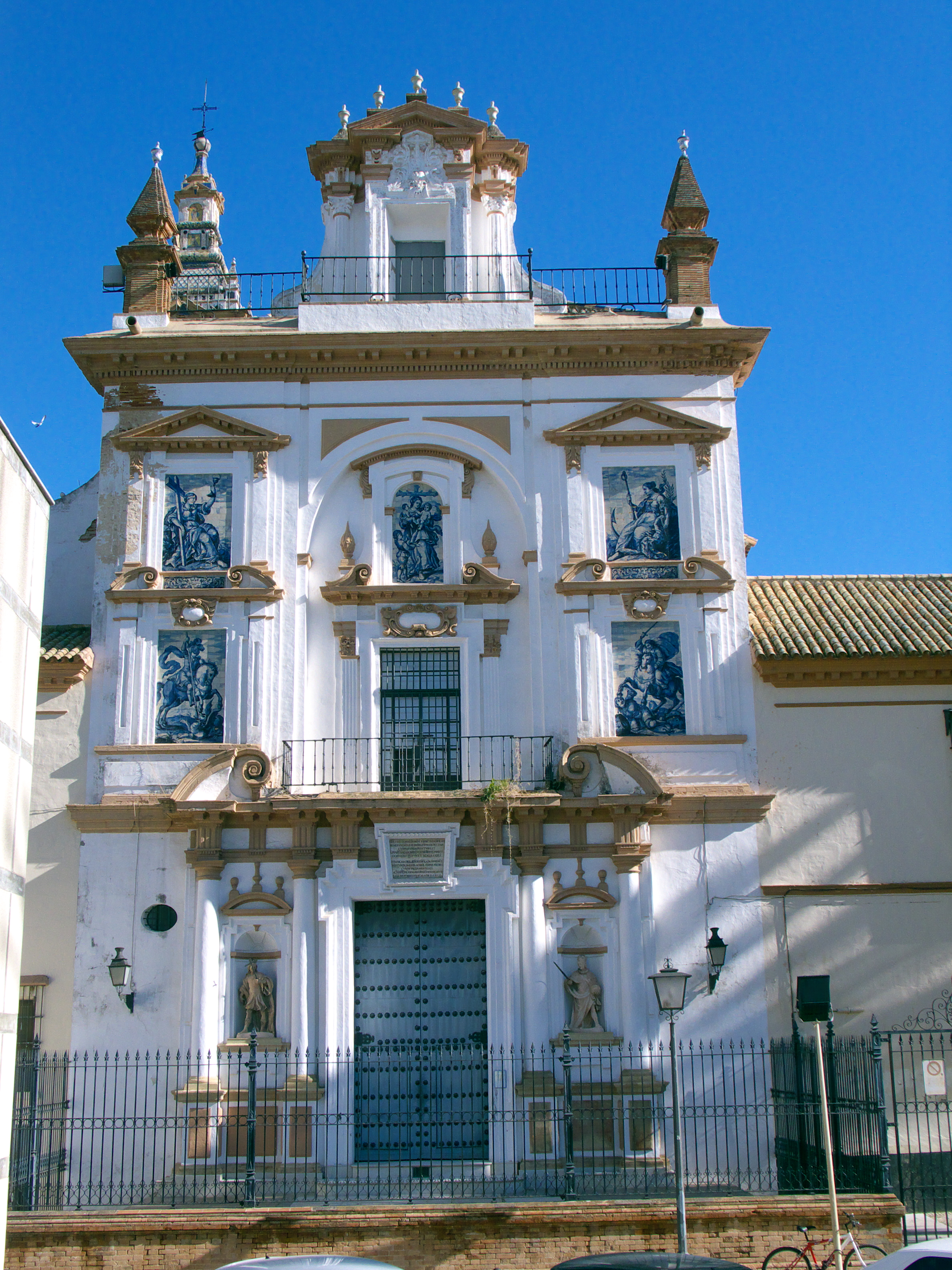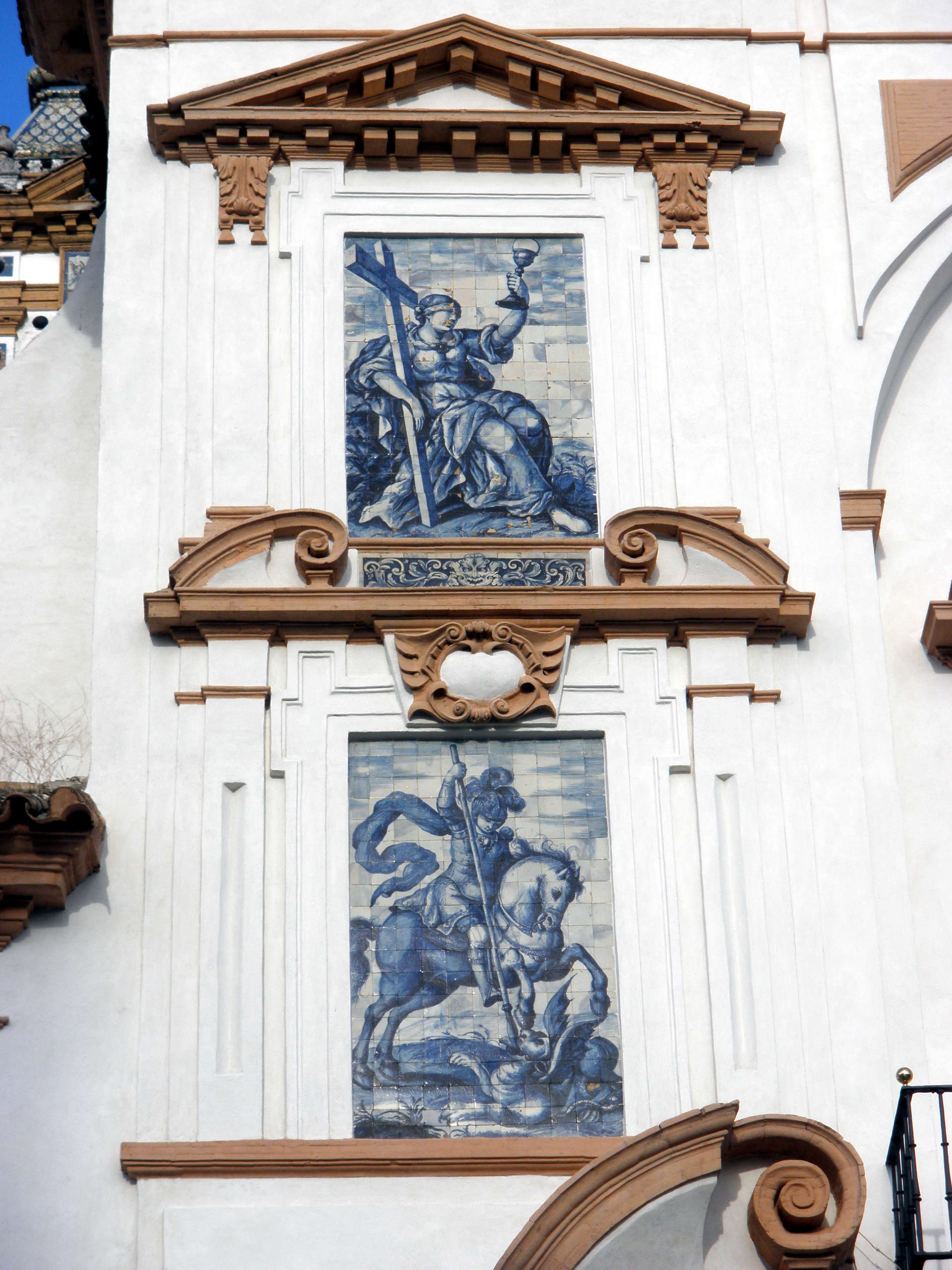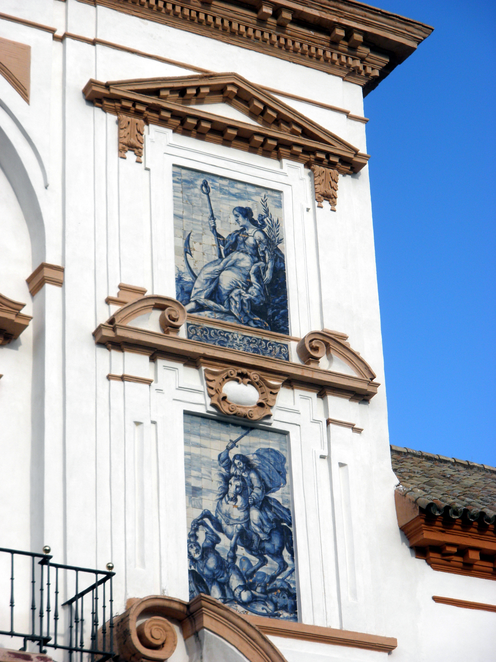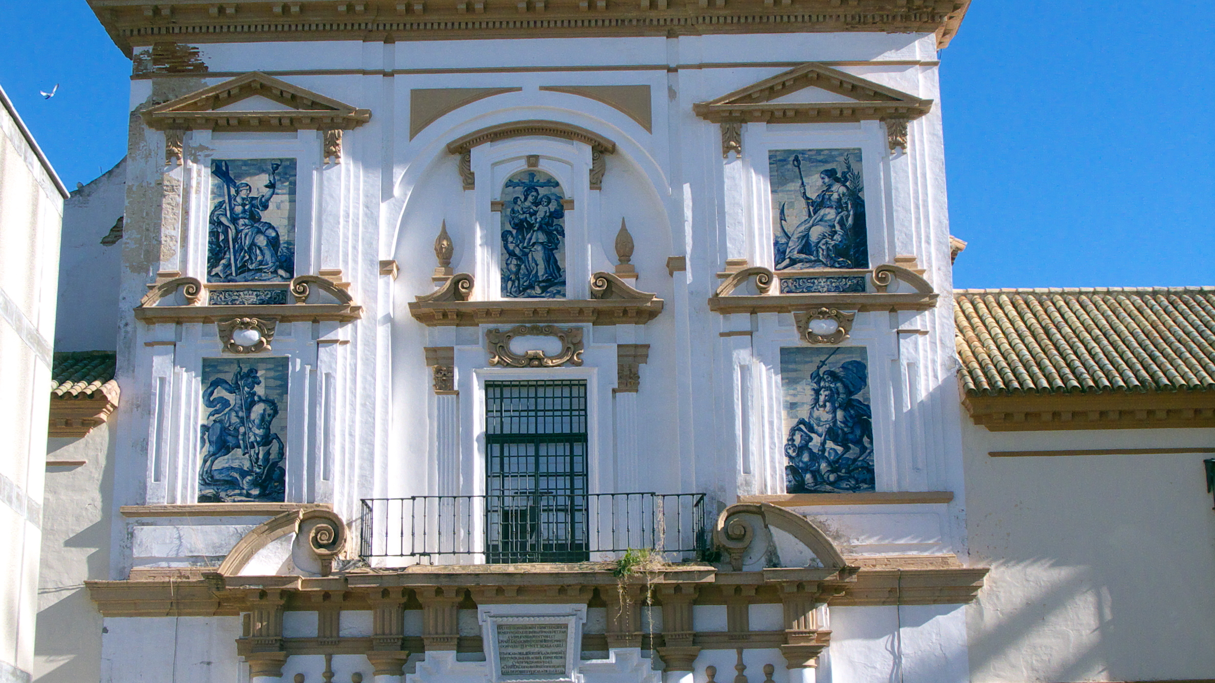 La fachada de la Iglesia, obra representativa “cumbre” del barroco sevillano, está decorada con azulejos que representan a sus patronos San Jorge y Santiago y a las tres virtudes teologales, La Fe, La Esperanza y La Caridad.