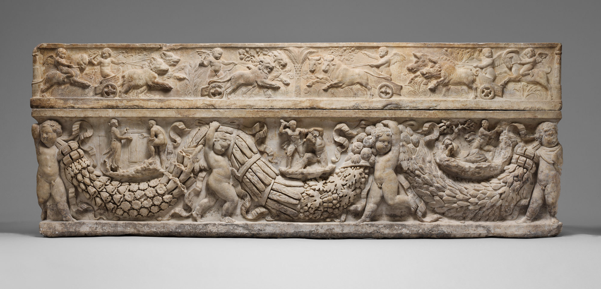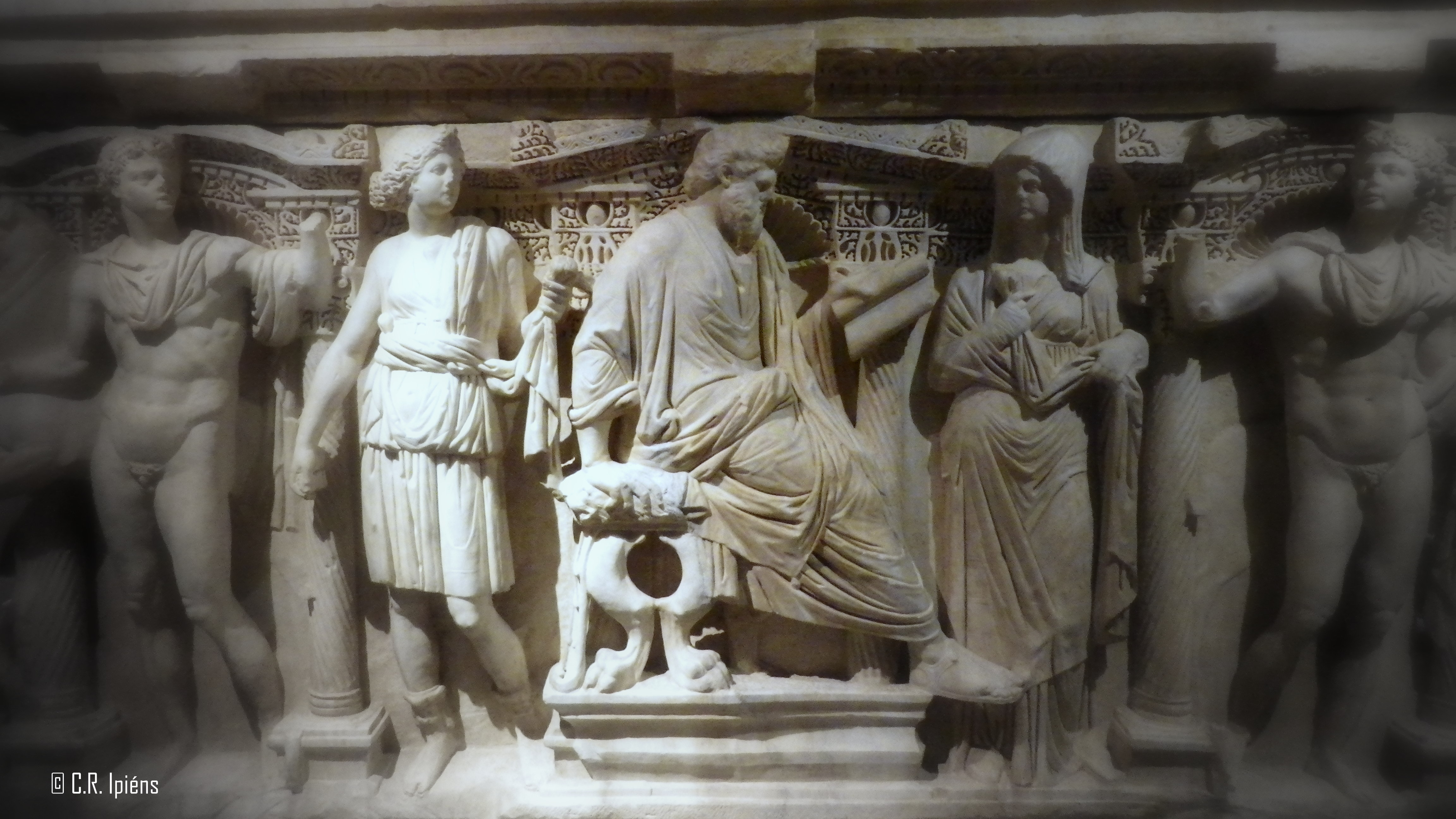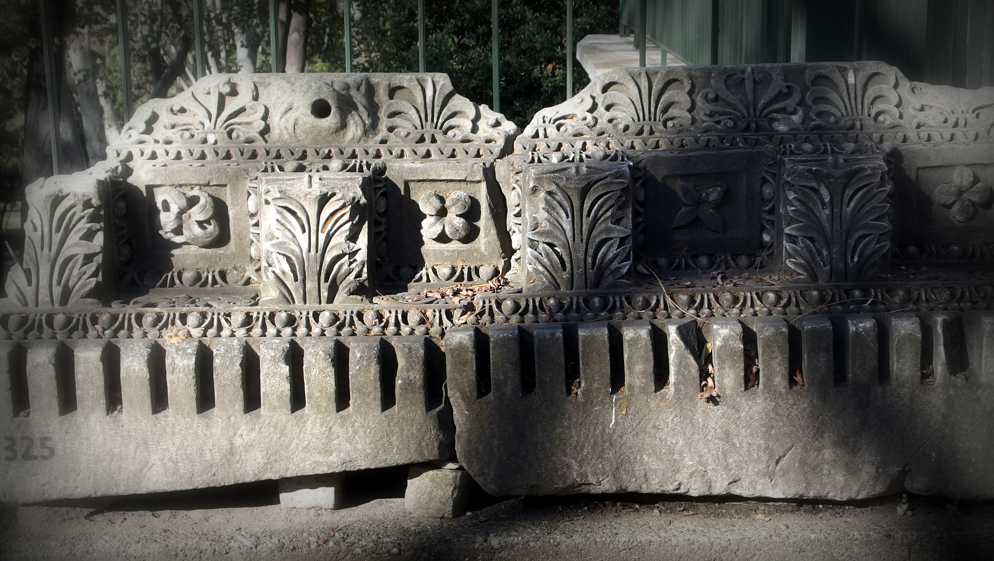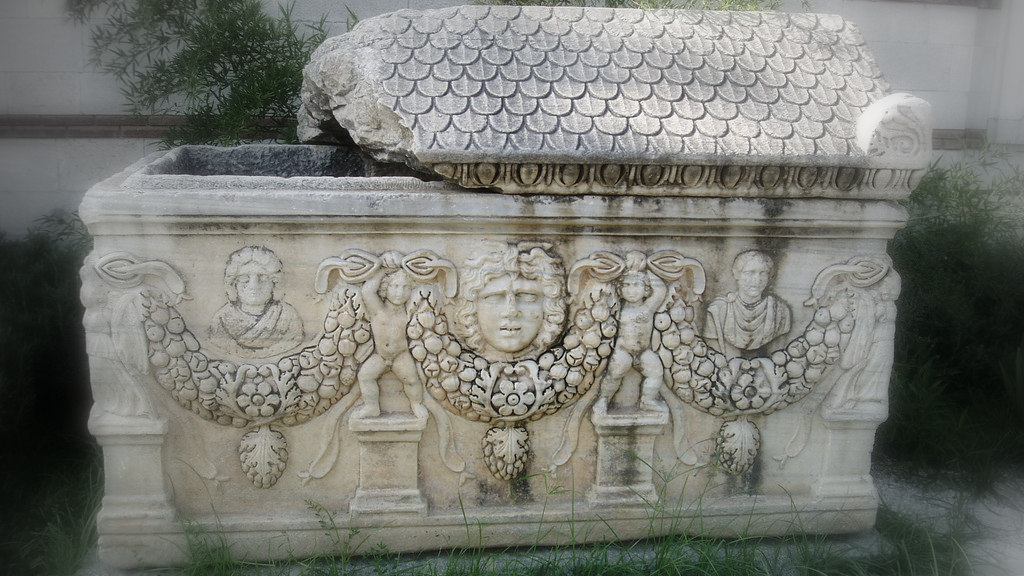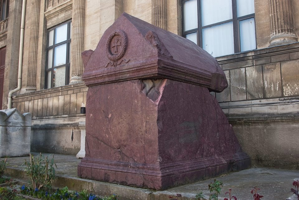 Tres sarcófagos de pórfido se encuentran ubicados fuera del Museo Arqueológico de Estambul. En éste, la cubierta es un techo inclinado con acroteria angular, en cuyo frente la cruz está tallada con un monograma cristiano incluido en una corona de laurel y flanqueado por letras alfa y omega.
