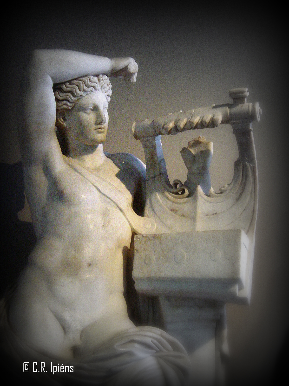 Apolo y Marsias se enfrentaron en un concurso musical en el que el ganador podría tratar al perdedor como quisiera. Los jueces fueron las Musas, por lo que naturalmente Marsias perdió y fue desollado vivo en una cueva cerca de Celenas por su hibris al desafiar a un dios. Apolo clavó entonces la piel de Marsias en un árbol (un pino que sobresalía de los demás en la versión del Pseudo-Apolodoro1), cerca del lago Aulocrene, y su sangre formó el río Marsias (afluente del Meandro, que desemboca en éste cerca de Celenas).