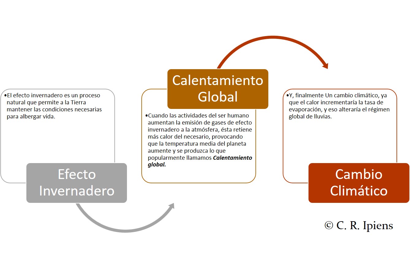 En primer lugar, es necesario aclarar dos conceptos que, si bien están estrechamente relacionados, con frecuencia se toman de manera errónea como sinónimos: el cambio climático y el calentamiento global. Existe una importante diferencia, y es que el calentamiento global es la causa del cambio climático, es decir, el aumento de la temperatura del planeta provocado por las emisiones a la atmósfera de gases de efecto invernadero derivadas de la actividad del ser humano, están provocando variaciones en el clima que de manera natural no se producirían.