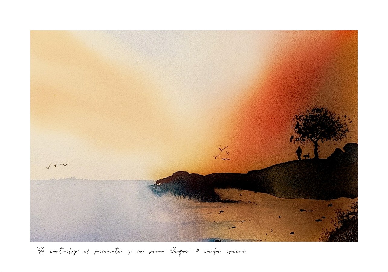 ‘A contraluz: el paseante y su perro Argos’ ; Acuarela en papel Arches, grano fino. 300g y 100% algodón. A4. © carlos ipiens