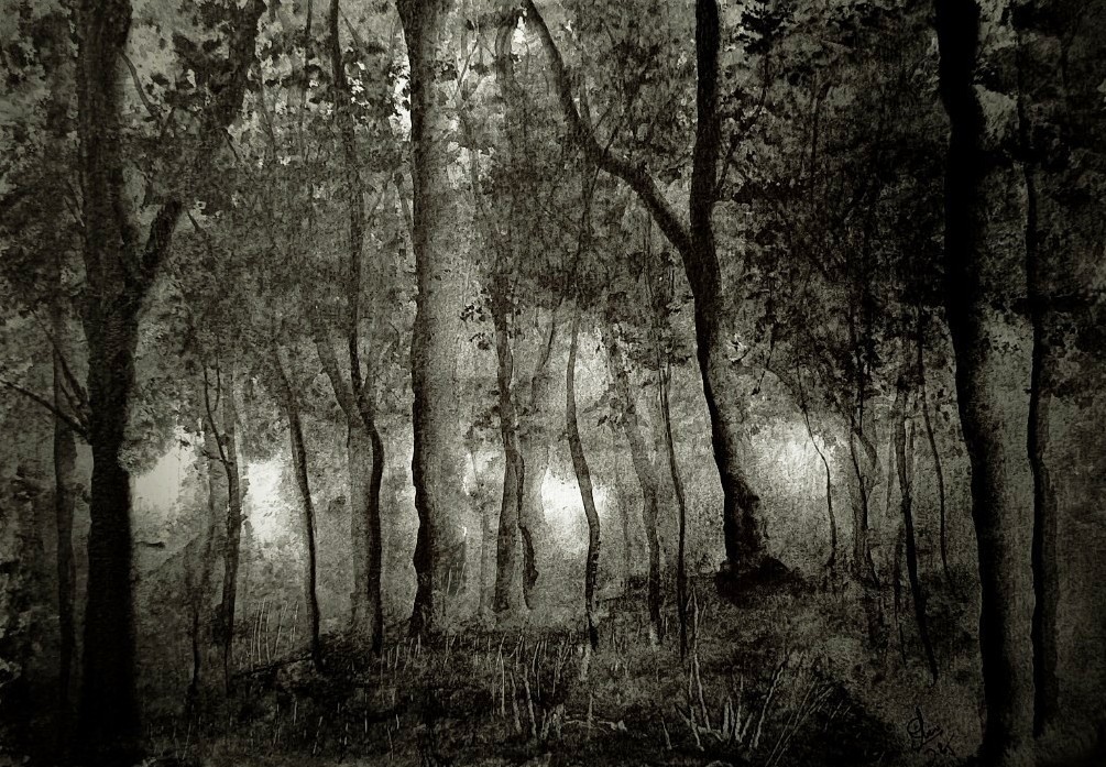 Esta acuarela monocroma, la he realizado con el pigmento Black Tourmaline Genuine de Daniel Smith, con ella he querido sumergir al espectador en un bosque que parece flotar entre el sueño y la memoria. La riqueza tonal de este único color —granulado, terroso, casi volcánico— permite construir una escena de gran profundidad sin necesidad de matices cromáticos.