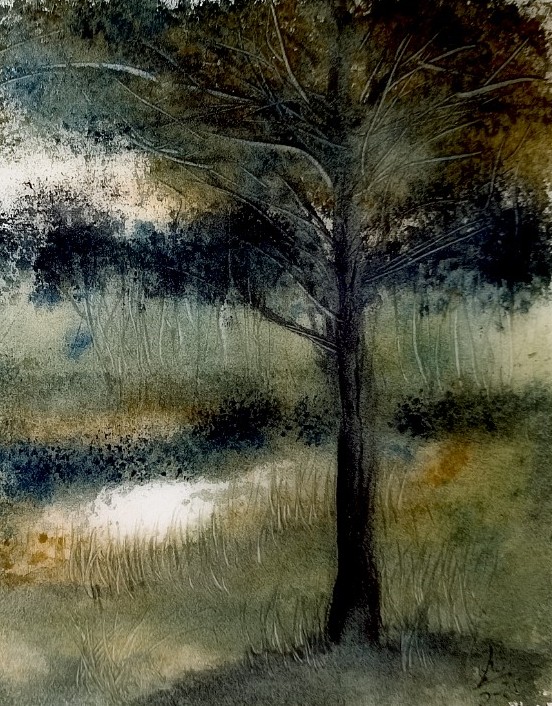 En esta acuarela, el árbol se erige como una figura silenciosa y sólida, en medio de un paisaje (wet on wet) que vibra con texturas húmedas y capas de luz tamizada. La paleta —dominada por verdes apagados (Undersea green, Tiger’s eyes) óxidos suaves y un azul profundo casi mineral—. No hay horizonte definido; el espacio parece surgir desde la emoción, como si la escena fuera una memoria más que un lugar.