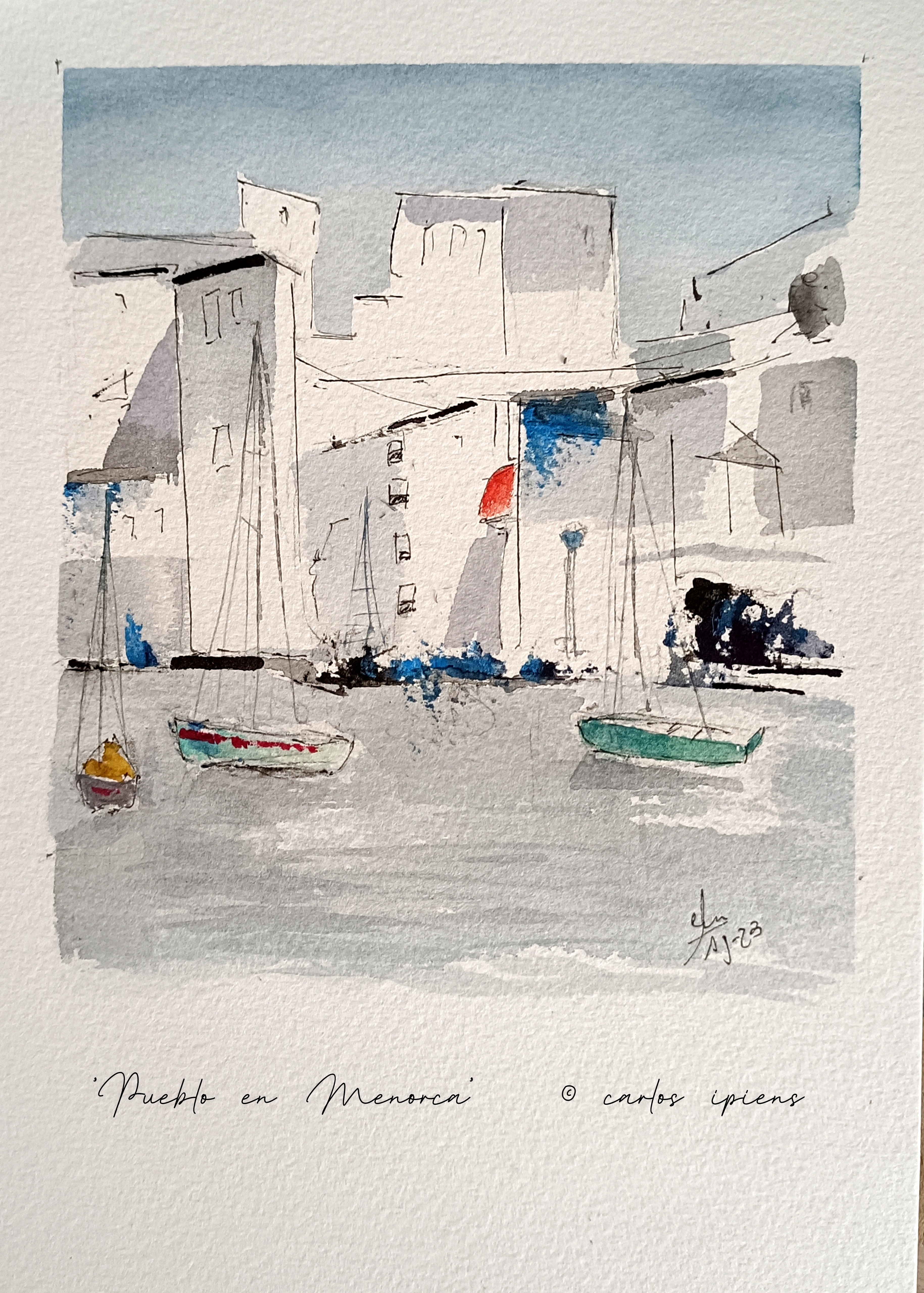 Esta acuarela quiere sintetizar la atmósfera mediterránea con trazos mínimos y luminosos. El uso de la espátula para la definición de las líneas hace que la acuarela respire un equilibrio entre la precisión del dibujo y la espontaneidad del gesto, también destacar los contrastes entre la suavidad del agua y la fuerza de los muros encalados. Las manchas de color, aplicadas con frescura, sugieren fachadas soleadas y barcos que descansan en calma. La obra transmite el sosiego de un puerto que se adormece bajo la claridad insular. La economía del trazo y la frescura de los pigmentos transmiten calma, como si la mirada del espectador se detuviera en una siesta de verano frente al puerto.