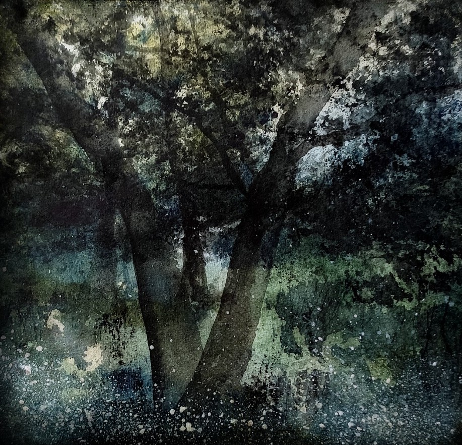 En “Los árboles” la técnica acuarelística se despliega en un estilo loose, donde la precisión cede espacio a la sugerencia y la atmósfera. Los contornos se desdibujan en favor de manchas líquidas que evocan la densidad del bosque sin describirlo por completo. La paleta oscura, con verdes profundos y matices azulados, refuerza la sensación de misterio, mientras que las salpicaduras blancas añaden dinamismo y evocan rocío o luz filtrada. La obra no busca narrar, sino despertar la emoción de estar entre árboles, rodeado de silencio y sombra.