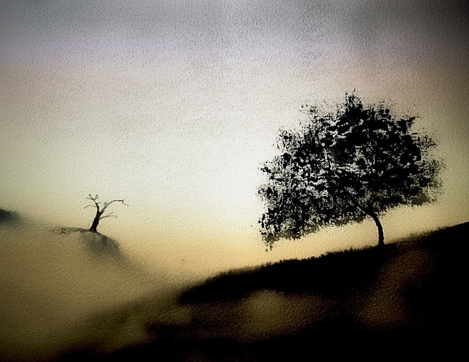 En esta acuarela, la composición se articula en un diálogo visual y simbólico entre dos árboles: en primer plano, un árbol frondoso y lleno de vida ocupa la ladera, proyectando su fuerza y vitalidad. Al fondo, distante y solitario, un árbol muerto se erige como eco del tiempo y la memoria. La neblina que separa ambos planos refuerza la tensión entre presencia y ausencia, entre plenitud y despojo, creando una narrativa poética donde la naturaleza se convierte en metáfora del ciclo vital.